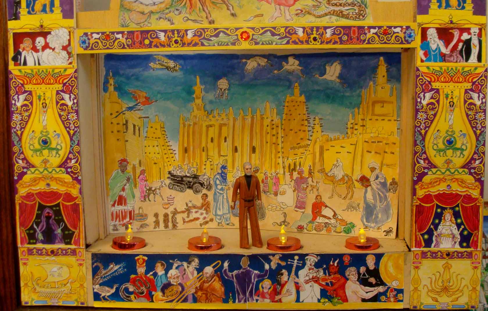 My favorite scene is the garden aviary (pictured in the first picture at the top). It is filled with beautiful flowering trees, spring bulbs, and birds from around the world. I put the tropical jungle half-set in front of it (see the arborial marsupials), but it sort of blocks the scenic vista. In fact I had all sorts of trouble photographing this. I am a better toymaker than photographer. Also some scenes are not finished (like the future city filled with post-humans and sentient robots, below). I also left the secret door on the back unphotographed. I will save it for a later day (but it is really cool and it also unifies the toy greatly). More to follow. In the mean time get out there and enjoy Halloween (oh, and direct some traffic over here, if you have a moment–I have been working hard making things for you to enjoy!).