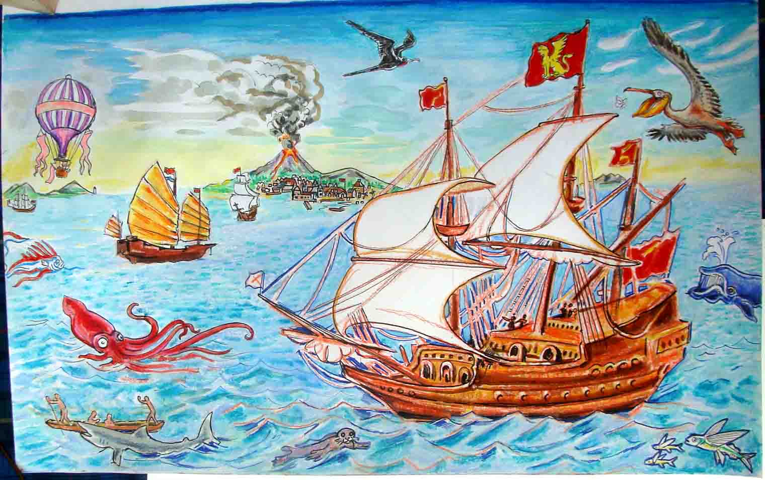 partner (with his vodka bottle), and a hungry walrus watching the fish tray above him. A couple of witches have slipped in without anyone noticing (Terry Pratchett would understand). The middle level is filled with thieves, lovers, merchants, and clergy people. The top level is filled with faceless shadow-folk on one side, and noble heroes on the other (notice the lady scientist, the luchador, and the martial arts master). The enraged colossal squidin the lower right was added expressly for this blog (although dedicated readers will notice many familiar elements).